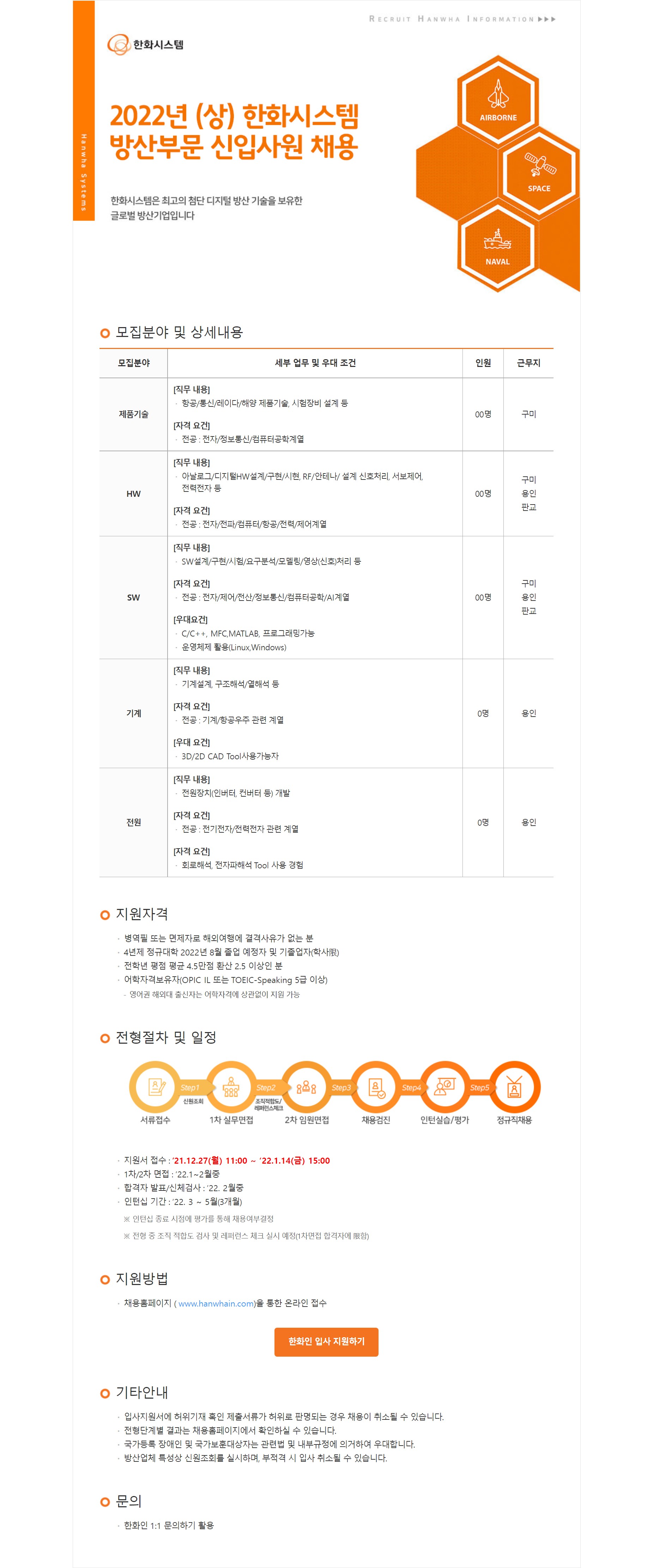 [ 공과대학 - 전자공학과 ] [한화시스템]방산부문 신입사원 채용 공고